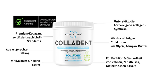 Colladent ist ein hochwertiges Nahrungsergänzungsmittel in Pulverform zur Herstellung eines geschmacksneutralen Getränks. Es kombiniert zertifizierte grasgefütterte SOLUGEL™-Kollagenpeptide mit Glycin, Vitamin C und essenziellen Mineralstoffen, um die Gesundheit von Zähnen und Zahnfleisch optimal zu unterstützen.